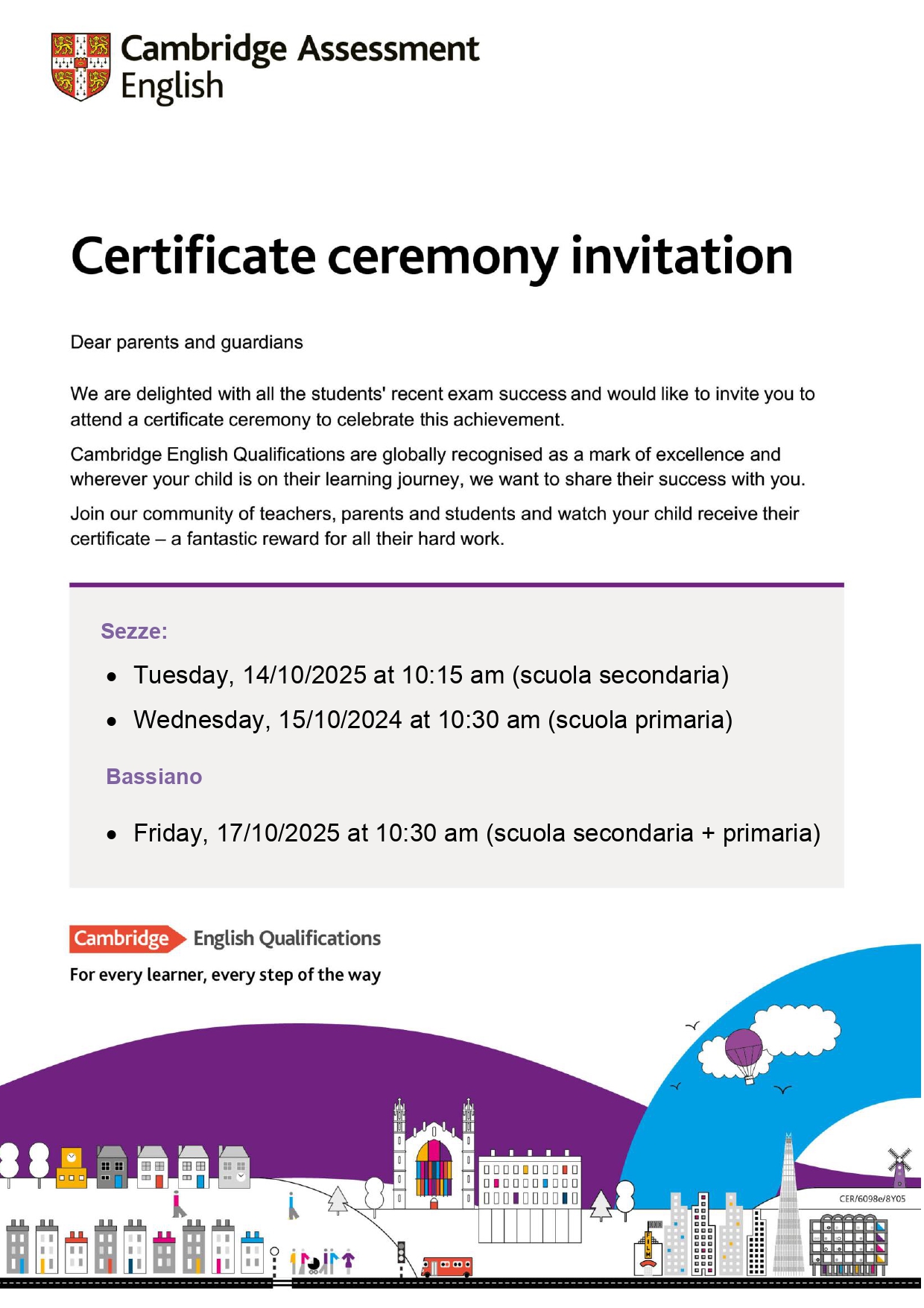 Gli alunni di Bassiano, sia della scuola primaria sia della scuola secondaria, riceveranno invece gli attestati il giorno venerdì 17 Ottobre ore alle ore 10:30 presso la scuola di Via dei Martiri.